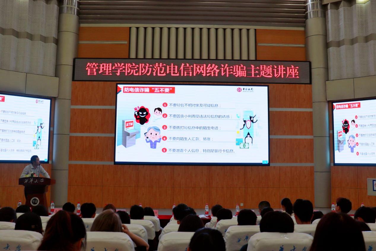 讲座围绕“什么是电信诈骗”“电信诈骗的常见形式”“如何识别防范电信诈骗”“补救措施及应对方法”等方面展开,向同学们讲解了电信诈骗的特点与常见案例,鼓励同学们积极主动学习防范电信网络诈骗的相关知识, 努力提高自身防范意识。